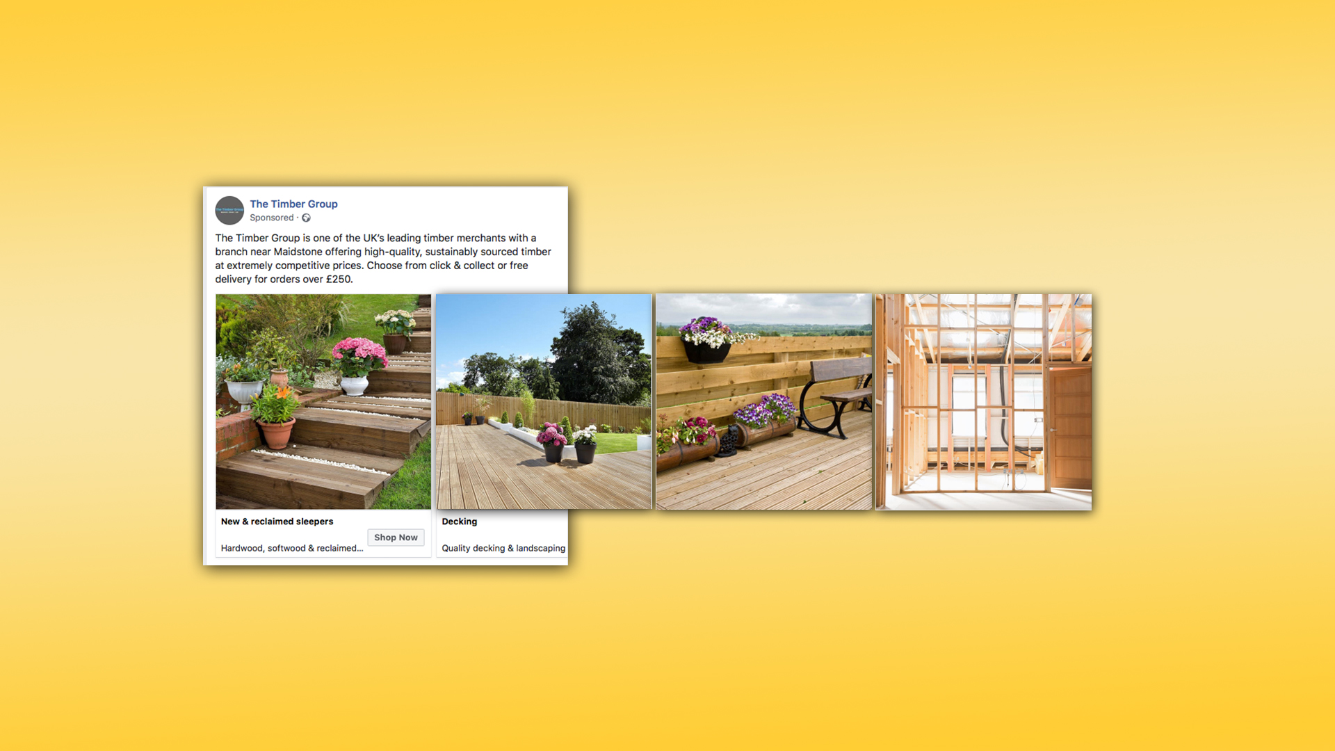 We also developed a carousel ad for Facebook which we used in two ways. Firstly retargeting people that had visited the site but had not converted on the first visit. Secondly targeting people living in the immediate vicinity of each branch with an interest in DIY and gardening or who worked as carpenters and builders.