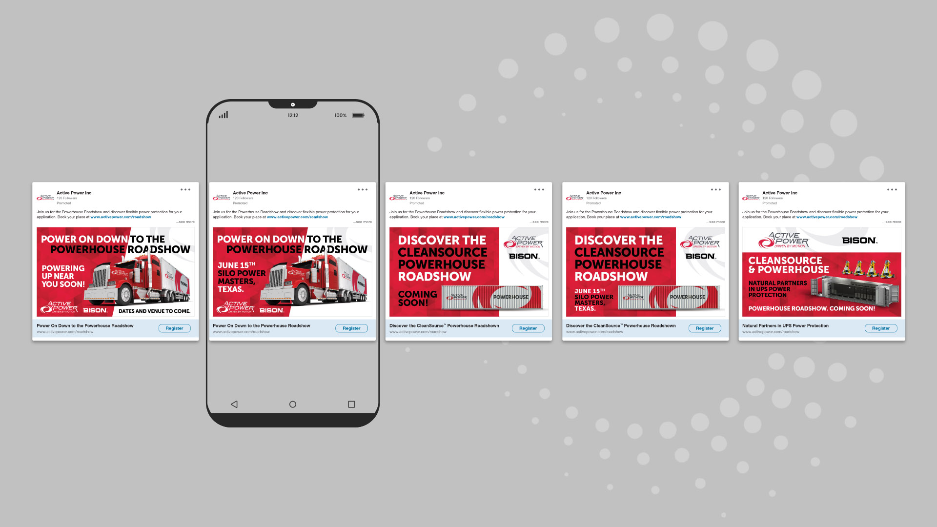 The roadshow successfully toured various US states, generating significant interest in Active Power’s flywheel UPS technology. Pre-show marketing collateral drove registrations and attendance, particularly through LinkedIn campaigns that reached a targeted professional audience. Event graphics created a strong visual presence at each stop, reinforcing Active Power’s leadership in the UPS market.