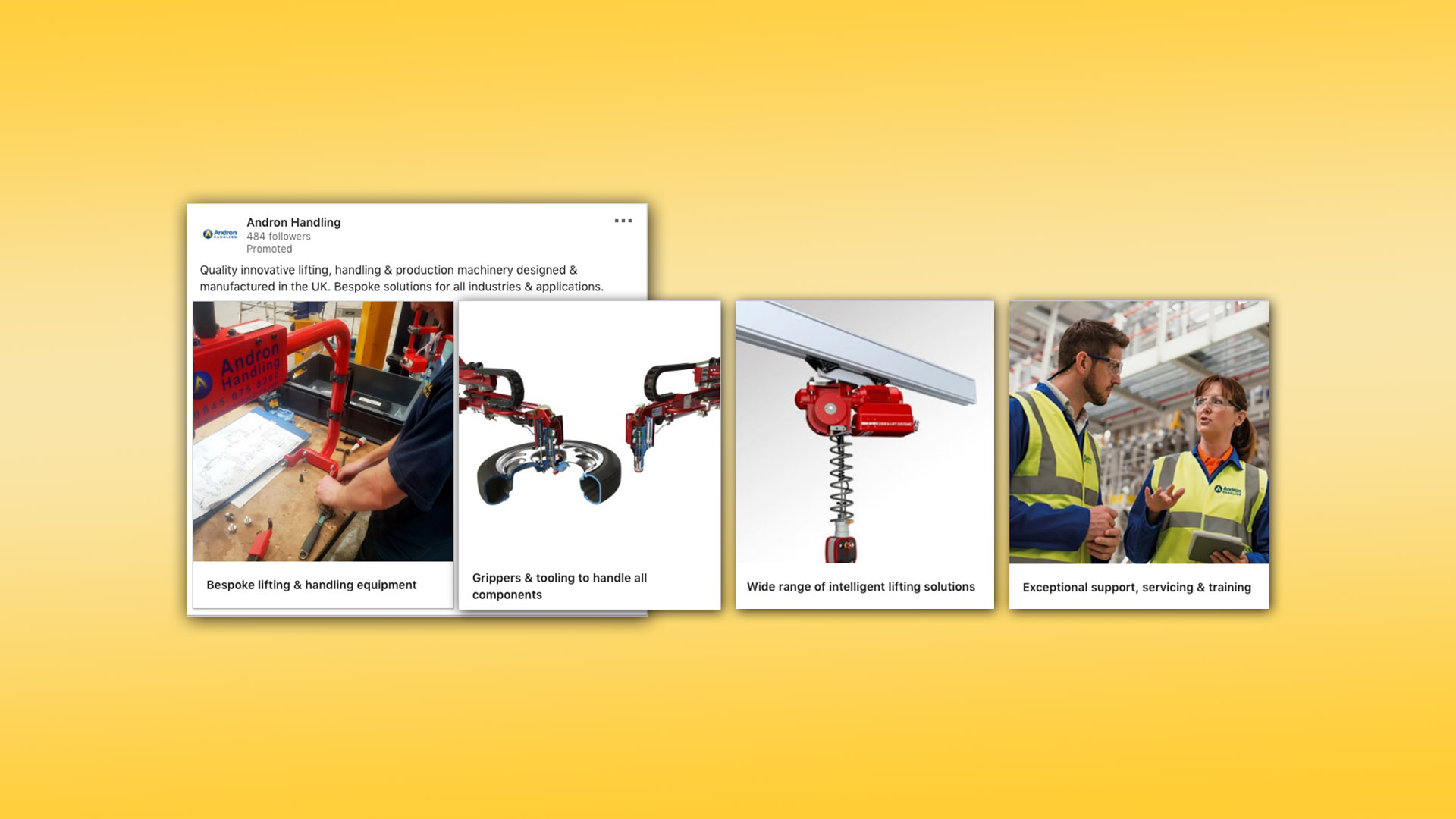 Our client, Andron Handling, wanted to raise awareness of their bespoke lifting and handling equipment across a number of industries including aerospace, defence, rail, warehousing & logistics, packaging, food & beverage and industrial automation. Andron was already well-known within the automotive sector but because of their heavy reliance on one industry they were vulnerable if the industry went into serious decline. Our strategy was to help them target new industries and attract a more diverse client base by carrying out a targeted LinkedIn advertising campaign.
