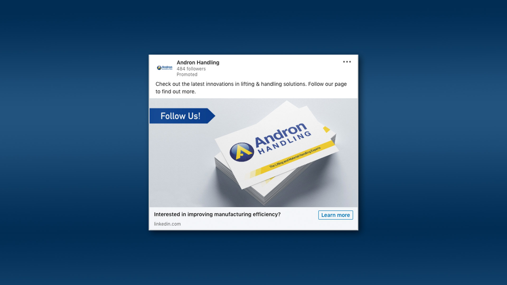 The follower campaign comprised an in-feed ad and two dynamic ads. The ads encouraged people to visit Andron Handling’s LinkedIn profile, explore the page and ‘follow’ the page.