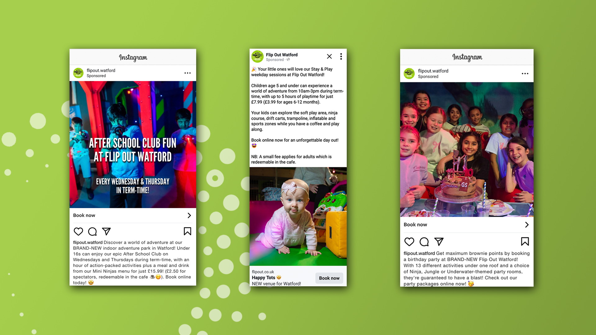 As a complementary effort, we worked on boosting Flip Out Watford’s organic reach. We launched organic social media posts to highlight the Stay and Play sessions, an off-peak offering designed to fill quieter times during the week. We also optimised Flip Out Watford’s Google My Business (GMB) listing, recognising that local visibility is crucial for leisure destinations. Based on our experience with similar brands like Go Ape and Jump In Trampoline Parks, we knew that GMB was a vital source of local traffic and bookings. By optimising this listing we ensured that Flip Out Watford would appear in local search results, driving organic bookings from people actively searching for things to do in the area.