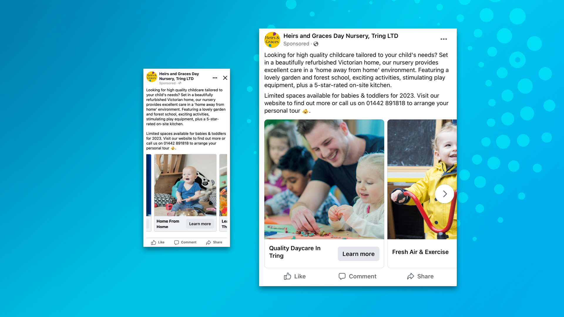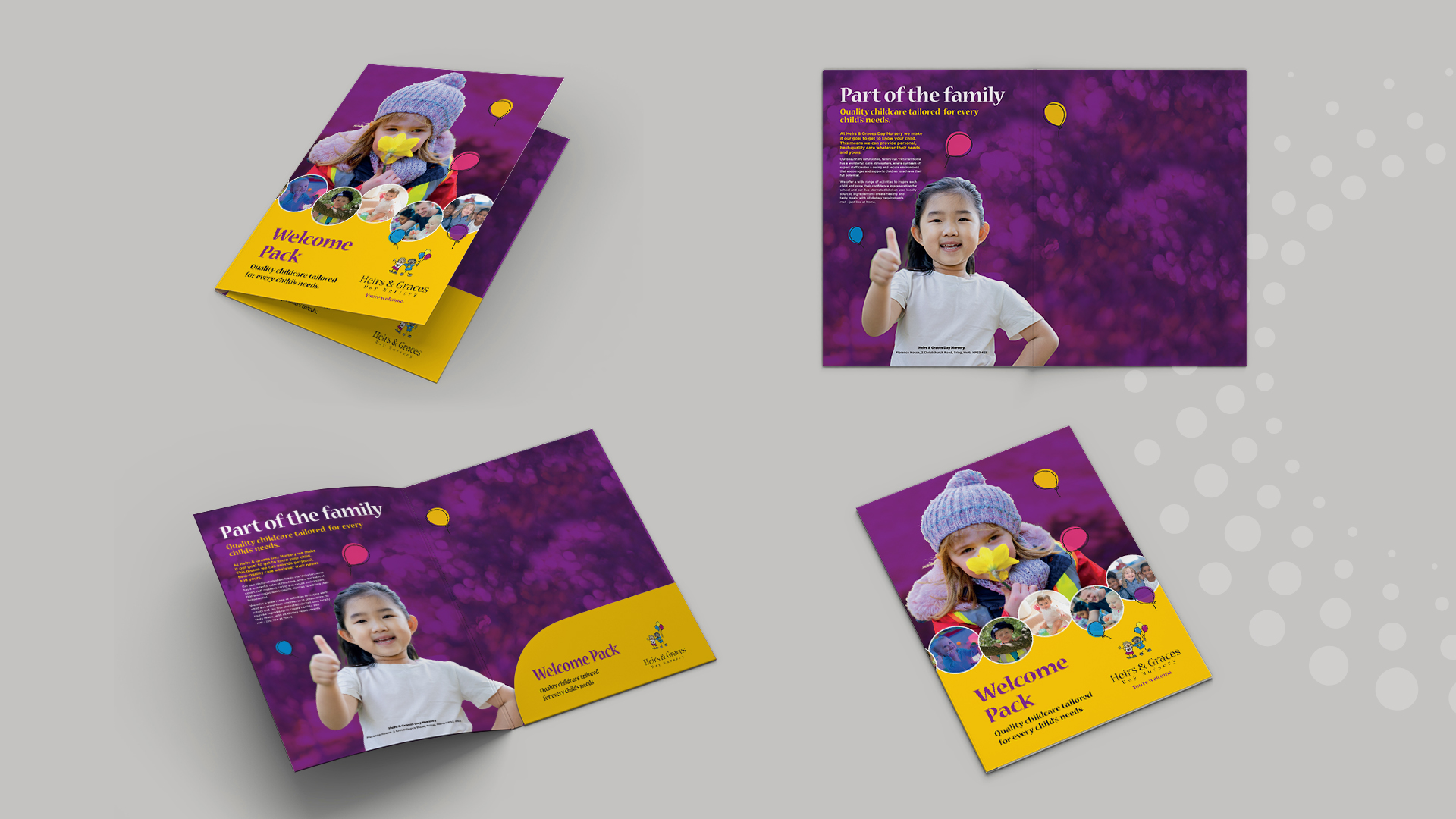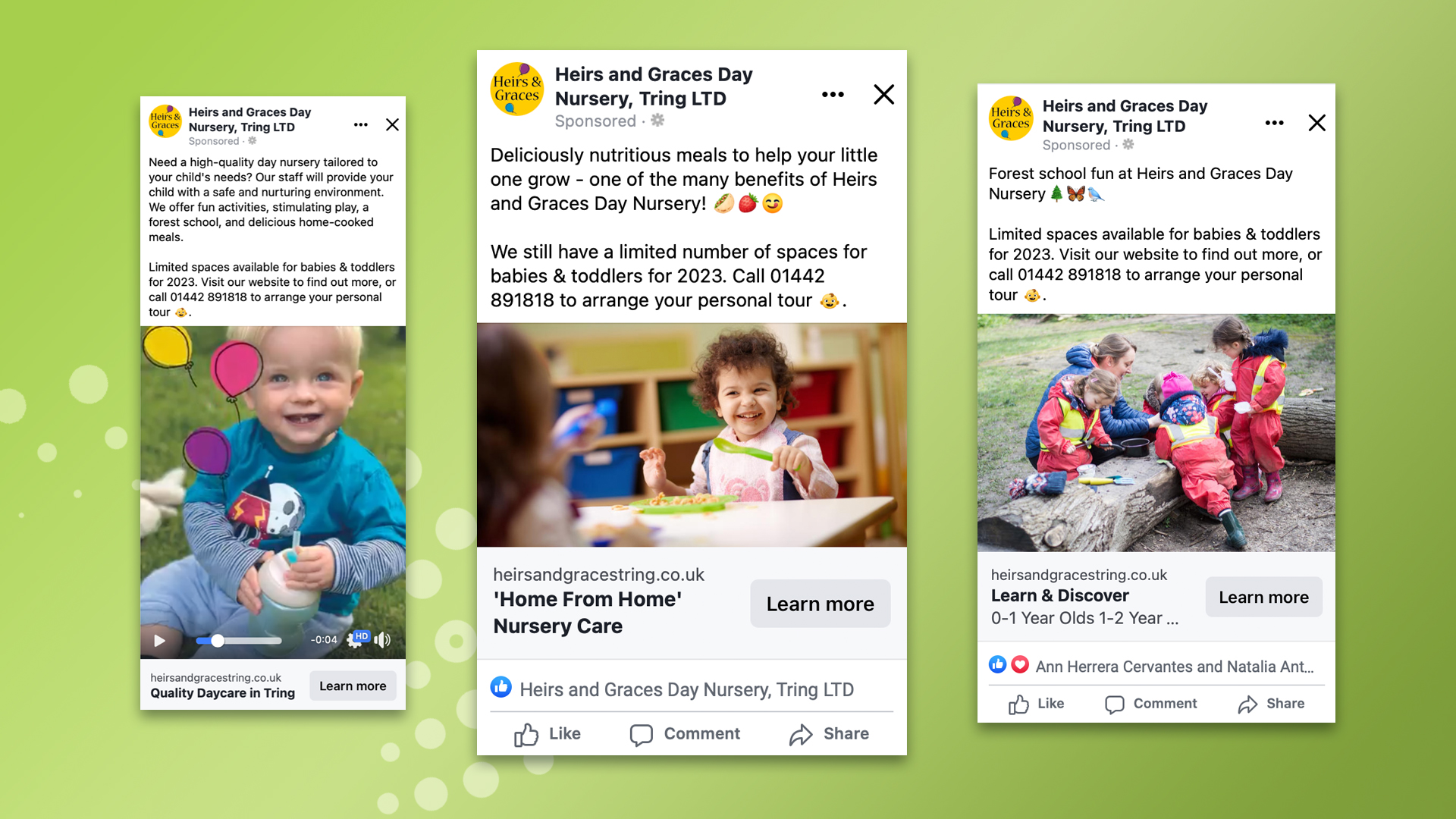To further enhance the nursery’s brand, we developed an engaging presentation folder for current and prospective parents, along with a second folder to welcome new staff members. Additionally, we developed a suite of Facebook advertisements to promote the nursery to appeal to parents in the Tring area. Our target audience comprised parents of young children between the ages of 0-5. The ads were crafted in a friendly and encouraging tone, highlighting the nursery’s key benefits and features, while emphasising how Heirs & Graces supports each child’s growth and development.