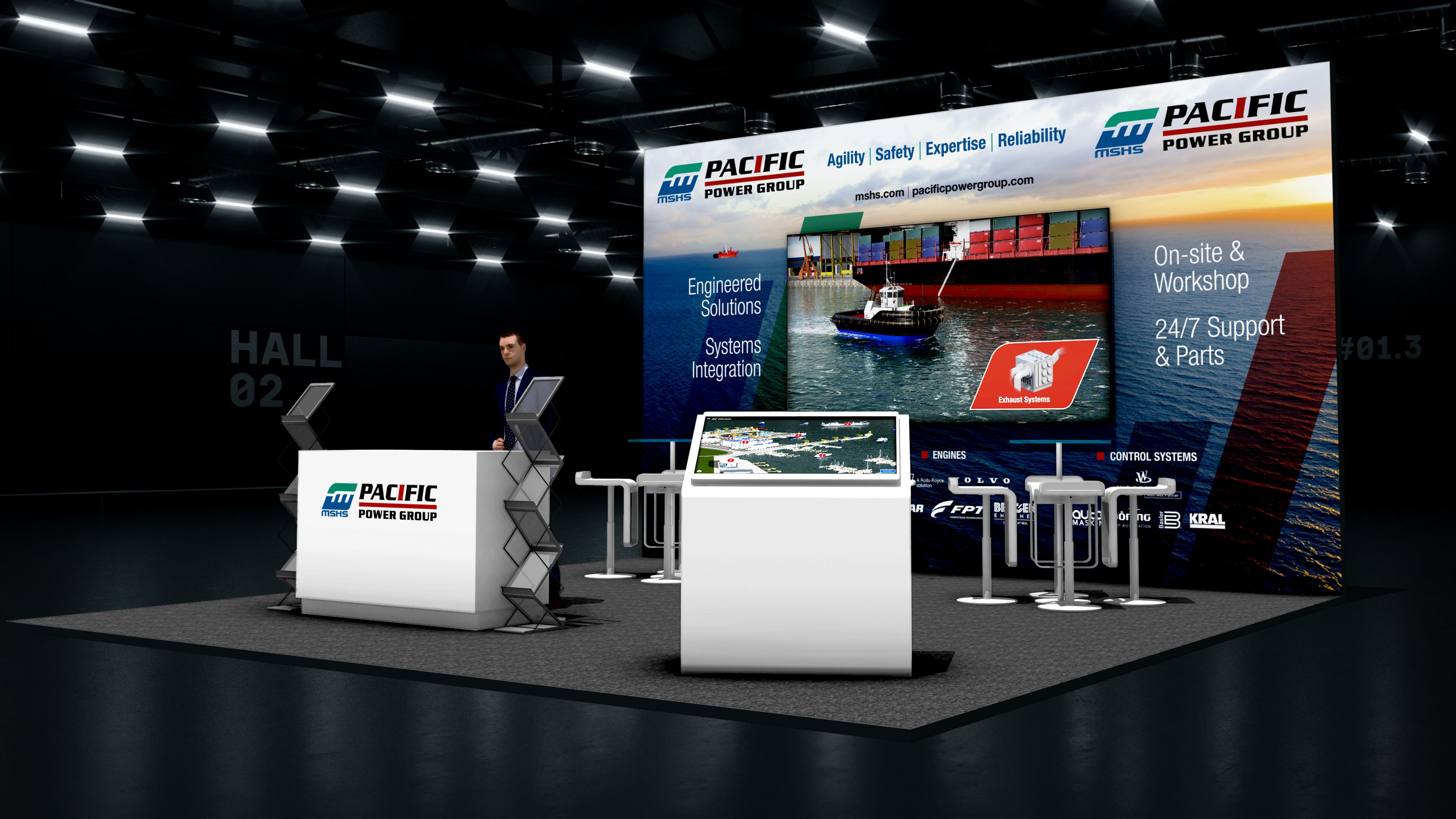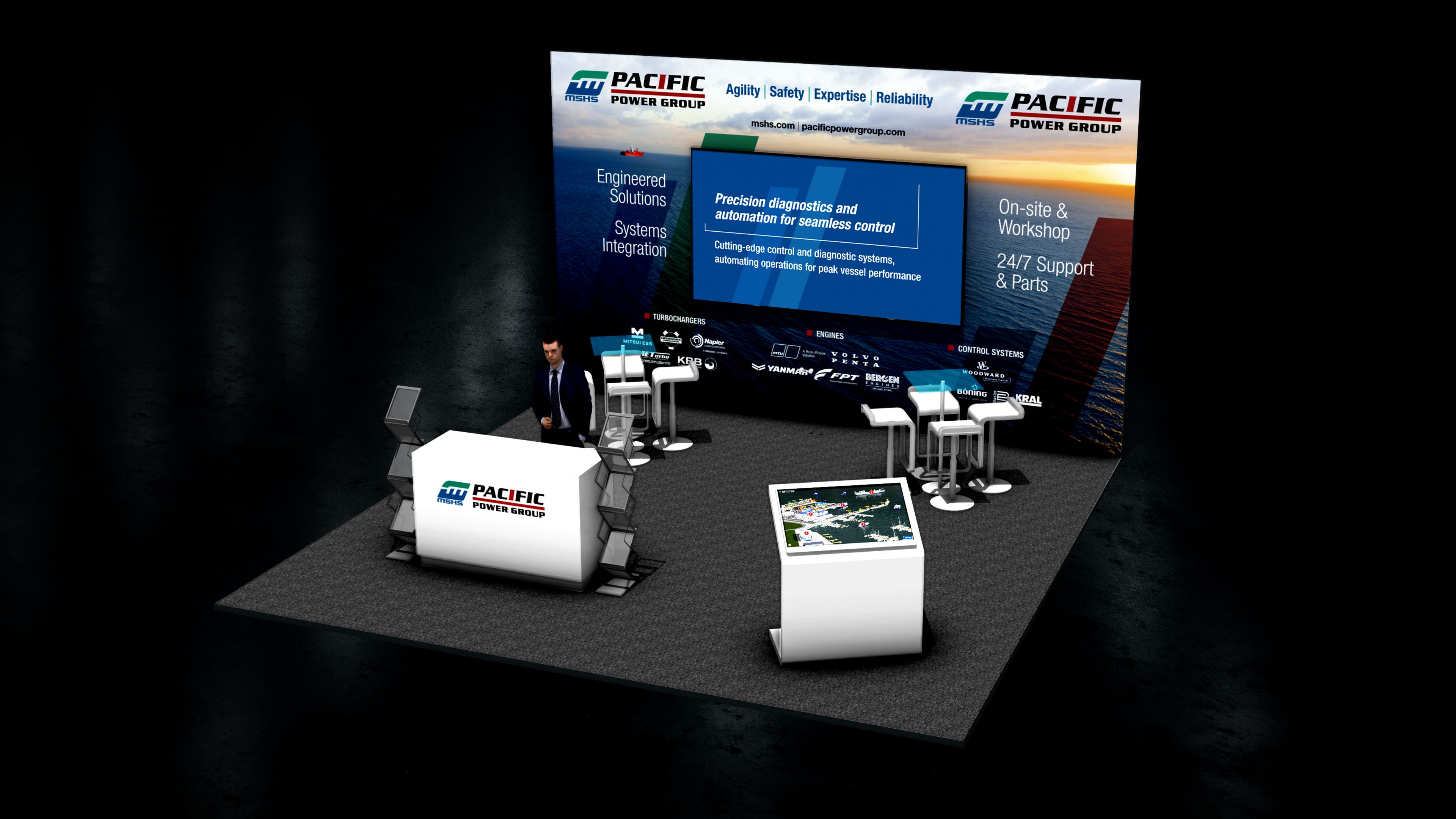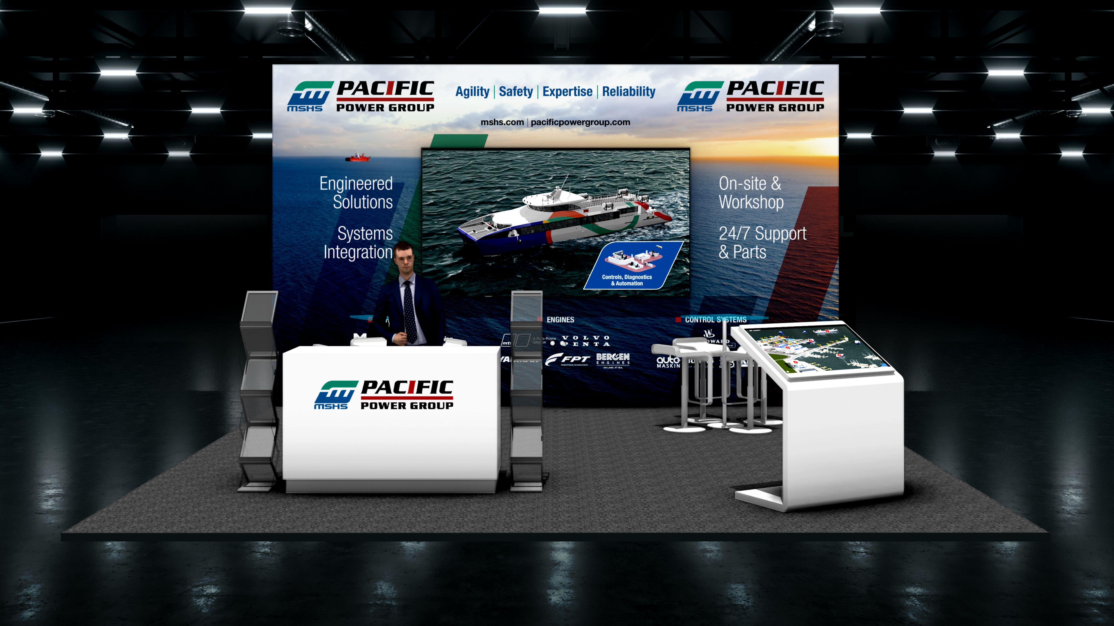 MSHS Pacific Power Group, a leader in marine and industrial plant power and propulsion solutions based in Florida, USA, sought to create an engaging, interactive experience that showcased its wide range of capabilities at the International Workboat Show 2024. With a need to demonstrate its expertise across different maritime and land-based applications, MSHS Pacific Power Group wanted an exhibition stand that would capture attention and encourage exploration of its offerings – from power and propulsion systems to control systems and other engine auxiliary systems. The project required both a comprehensive interactive environment and an animated video, each with precise art direction and seamless visual cohesion.