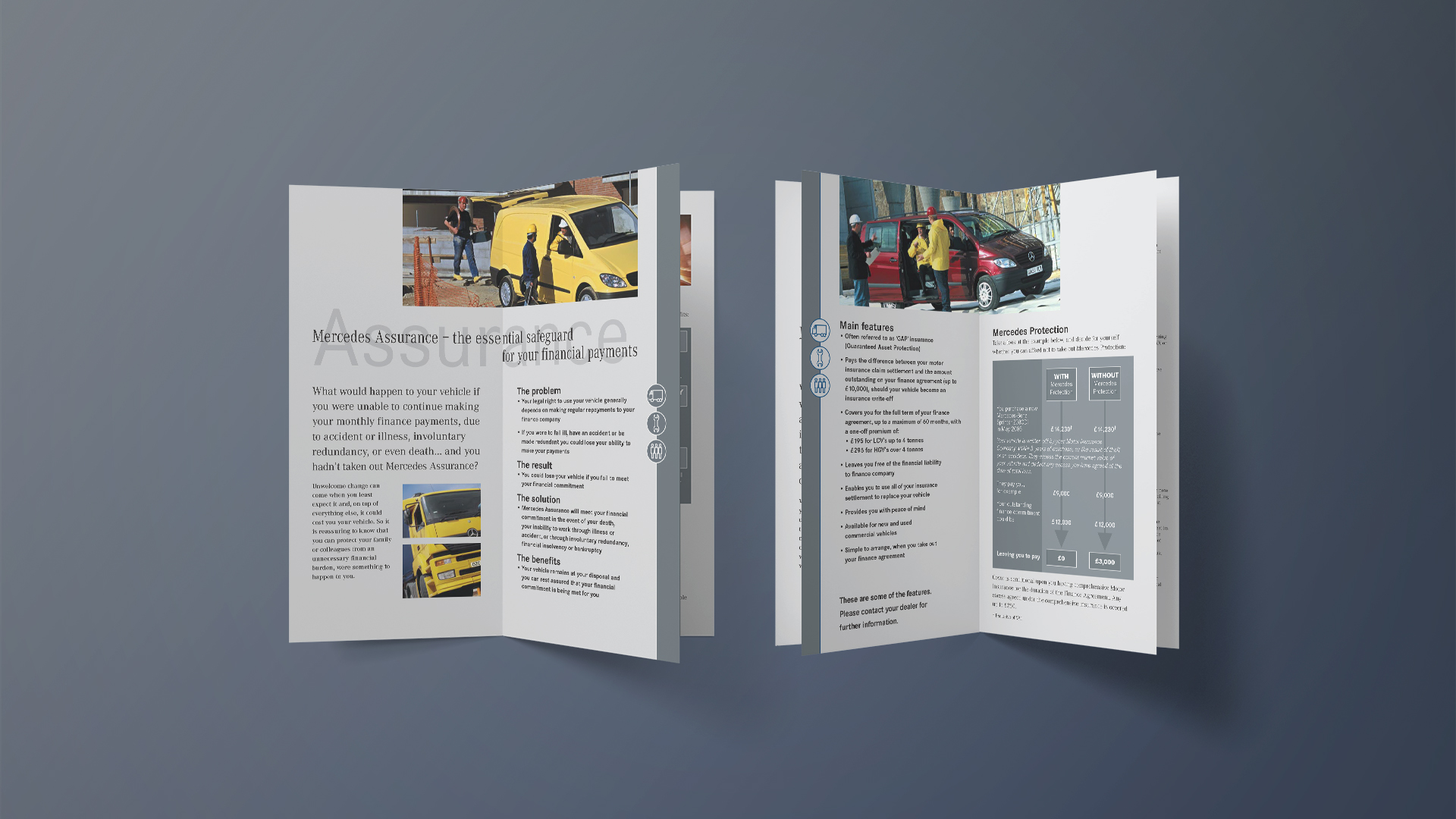 Developing marketing literature for the automotive sector giant Mercedes Benz Finance. To clearly communicate complex financial information in an easily digested way that reflected the aspirational nature of an established premium brand.