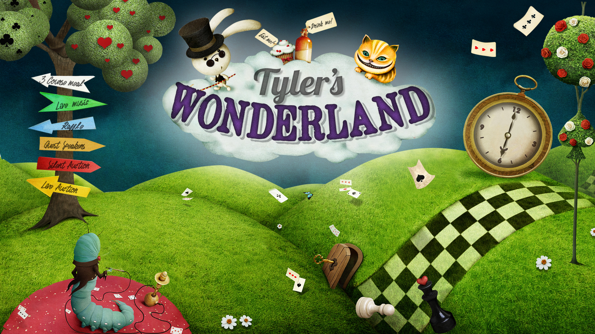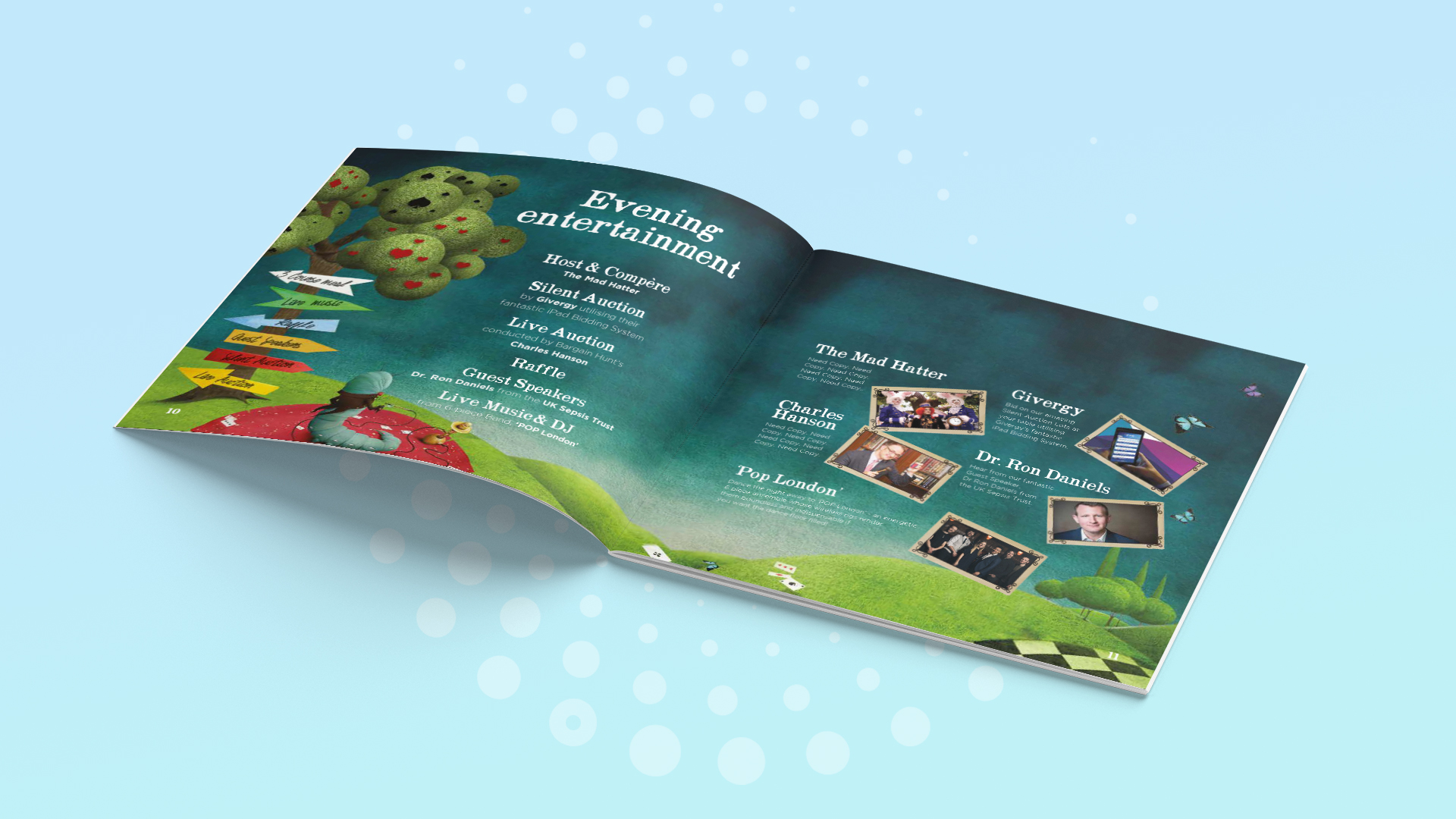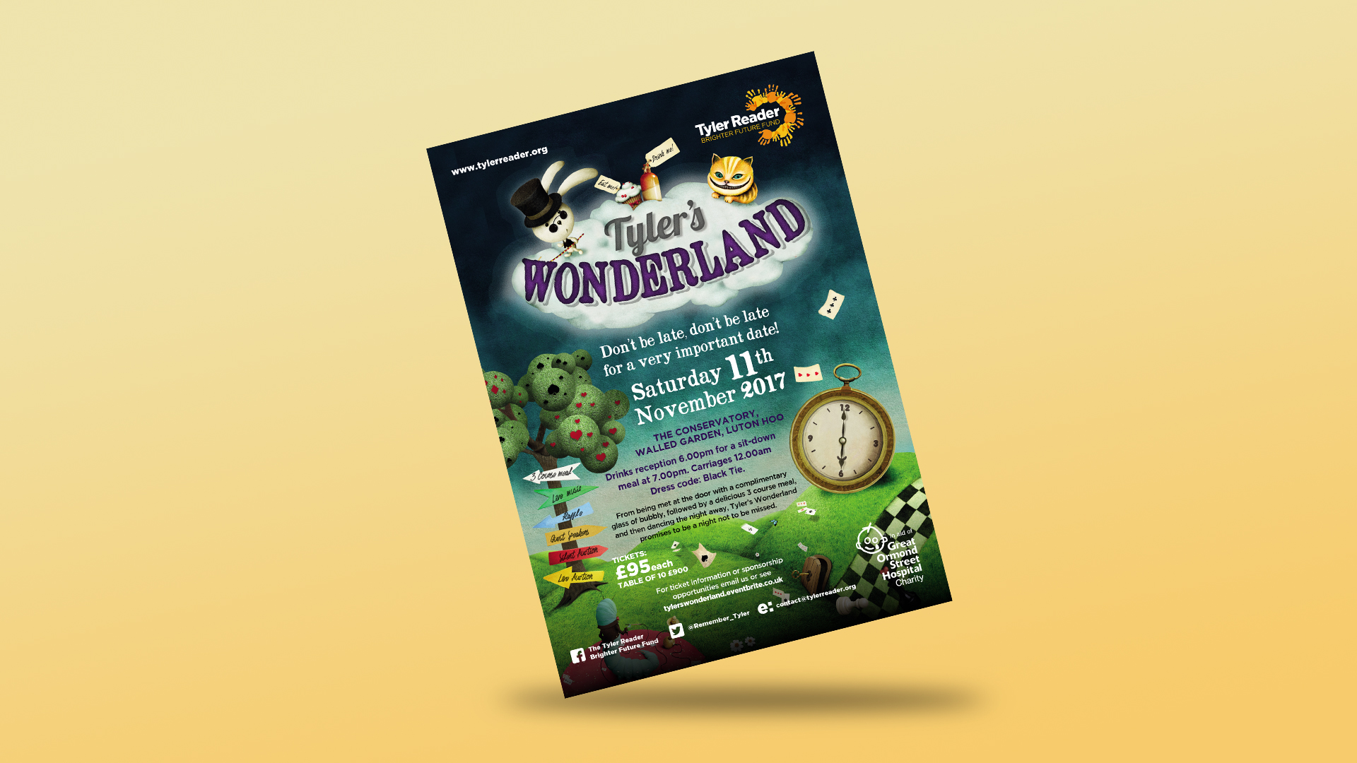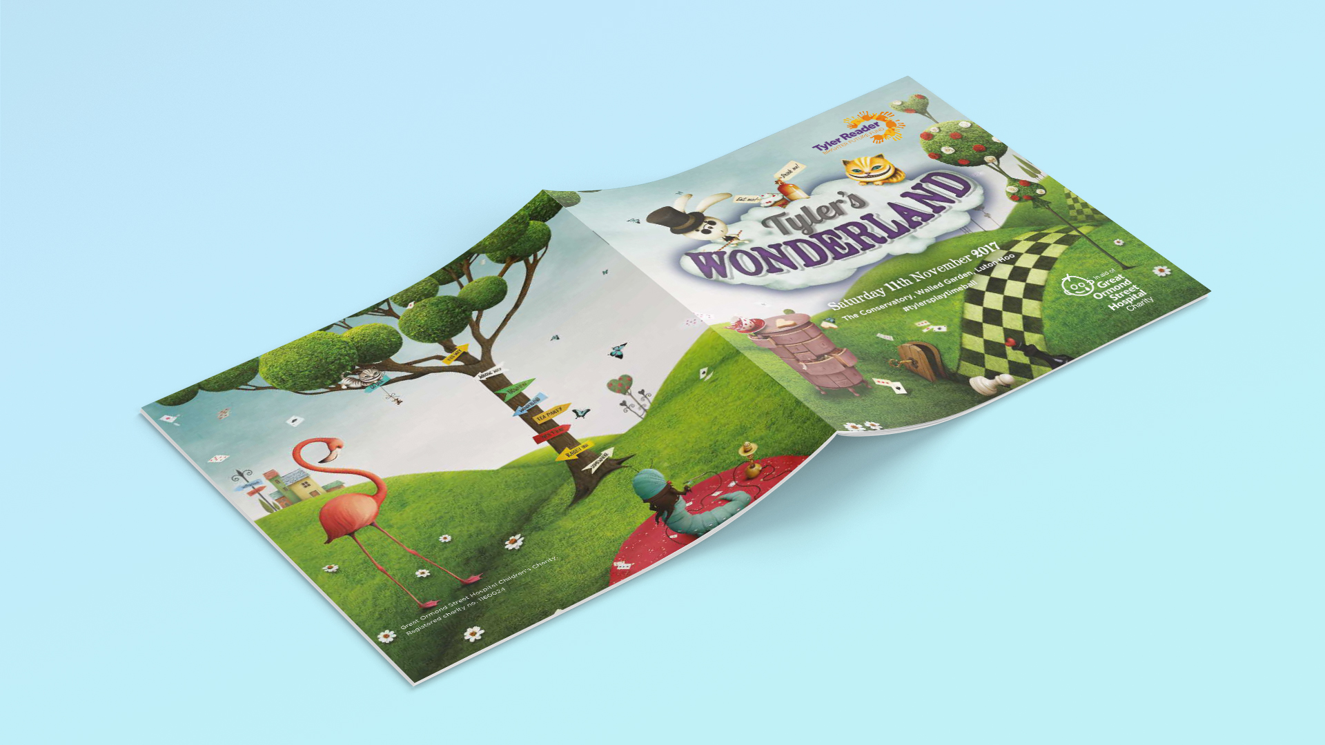 The charity went on to host two fantastic fundraising events at Luton Hoo Walled Garden in Hertfordshire, which we developed a range of marketing materials for. The first event was the circus-themed ‘Playtime Ball’ and the second fundraising event was themed ‘Tyler’s Wonderland’ based on the famous ‘Alice in Wonderland’ book. We designed and produced eye-catching flyers, posters and a 48-page event programme for each event.