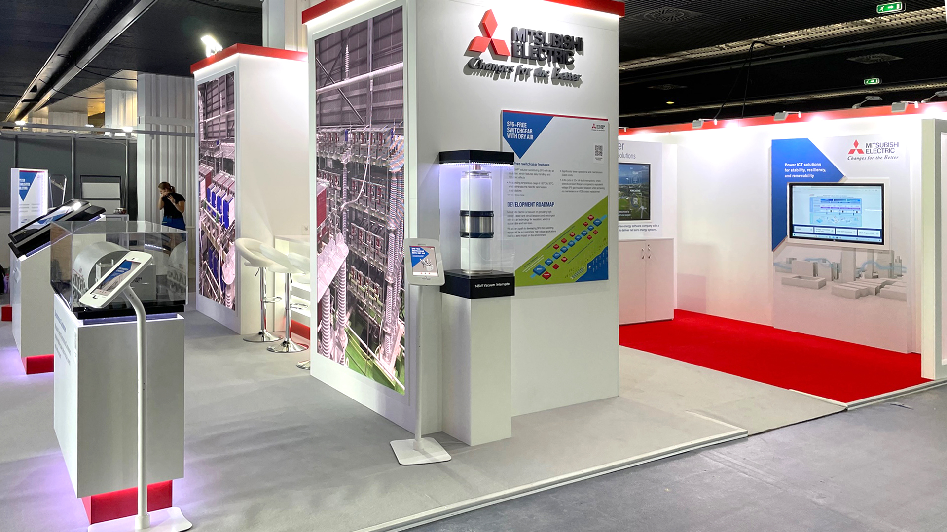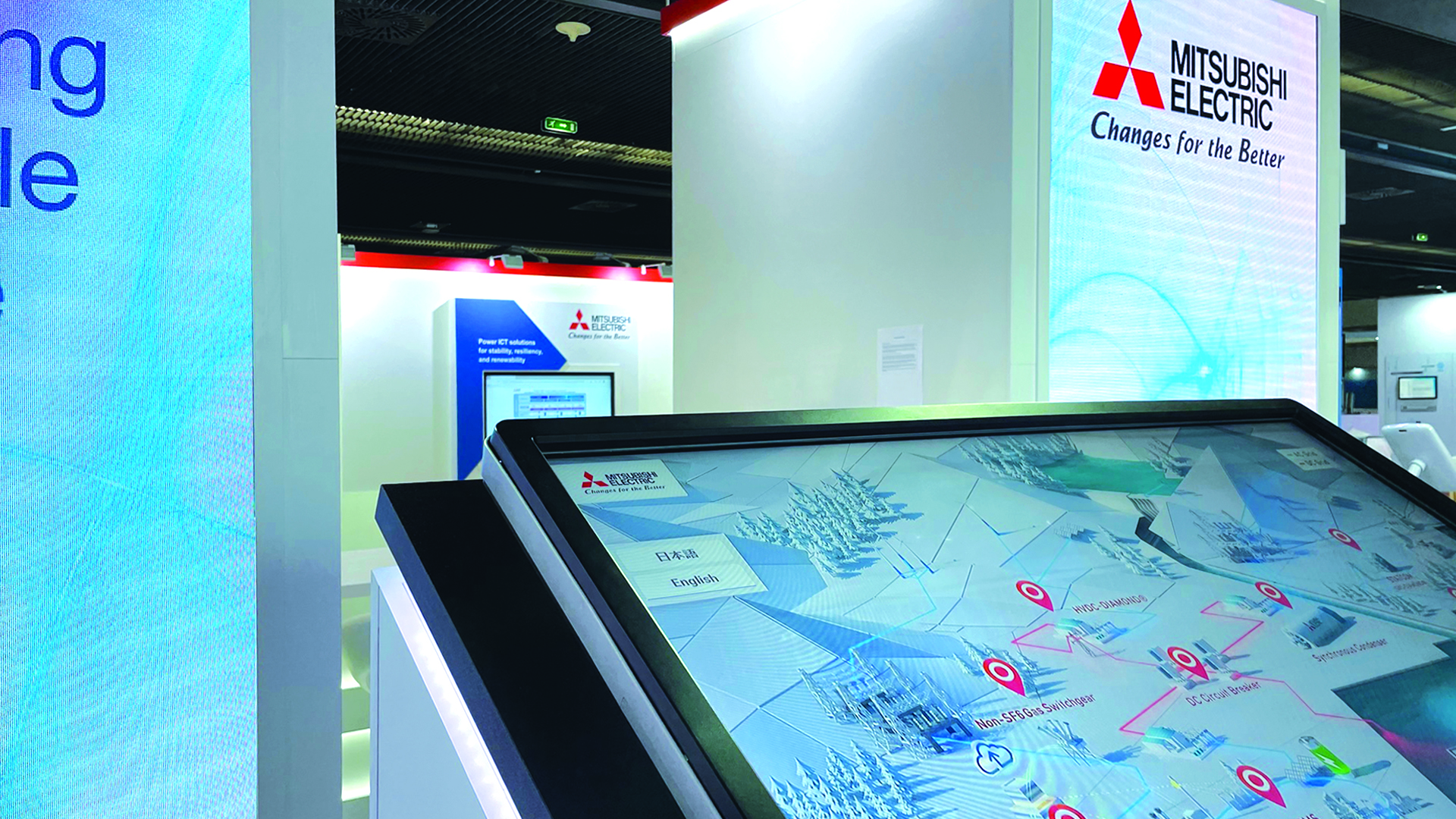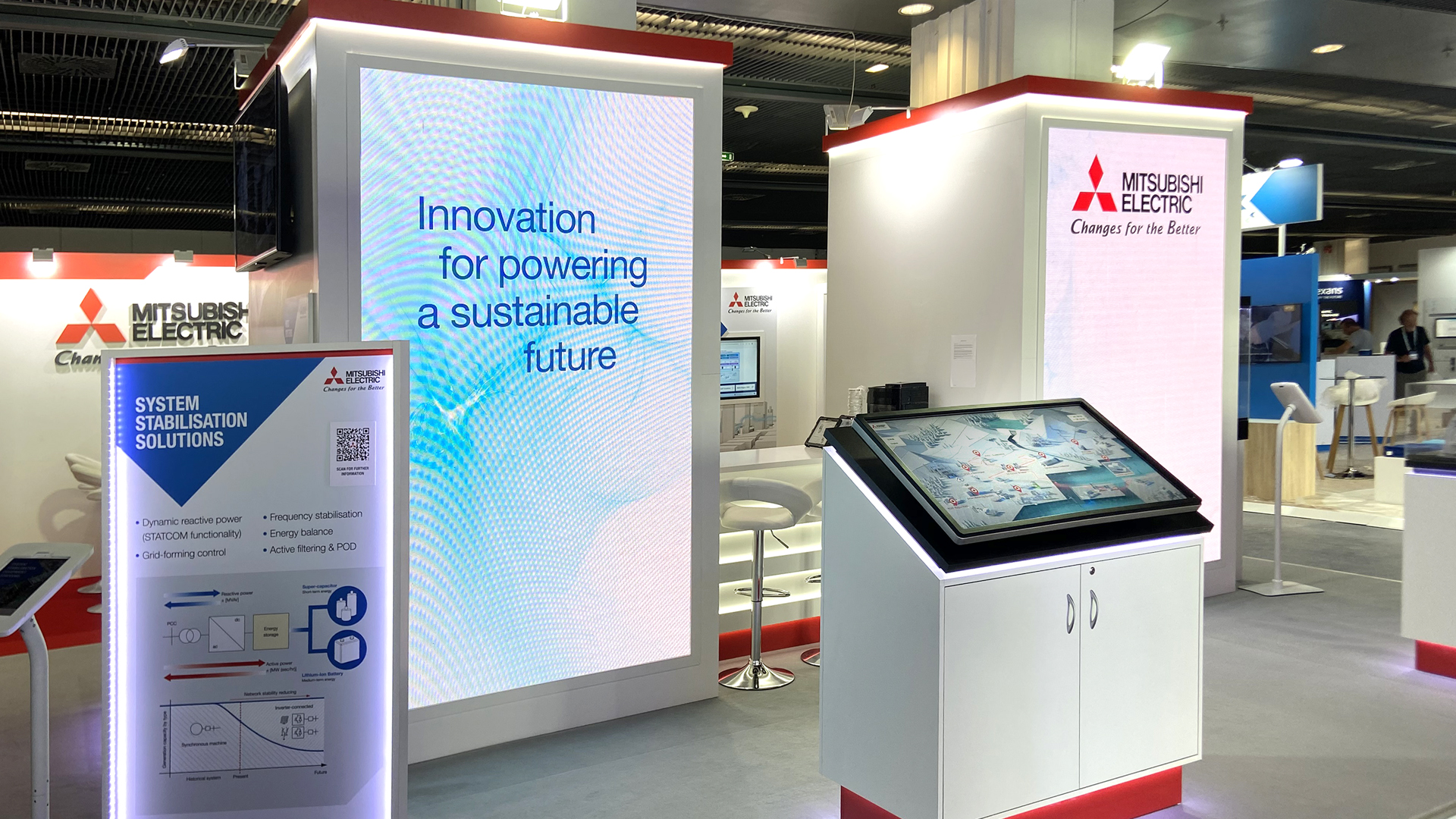 After the success of Cigré 2019, Oyster was approached by Mitsubishi Electric Power Systems Group (PSG) to create an impactful trade exhibition stand design for them at Cigré in Paris 2022. Unfortunately, two large venue columns dominated the centre of the stand and the ceiling height was prohibitively low. With new products and a decision to go digital, we needed to create an original, contemporary and appealing stand to reflect the company’s brand values, attract visitors and help generate new business leads.