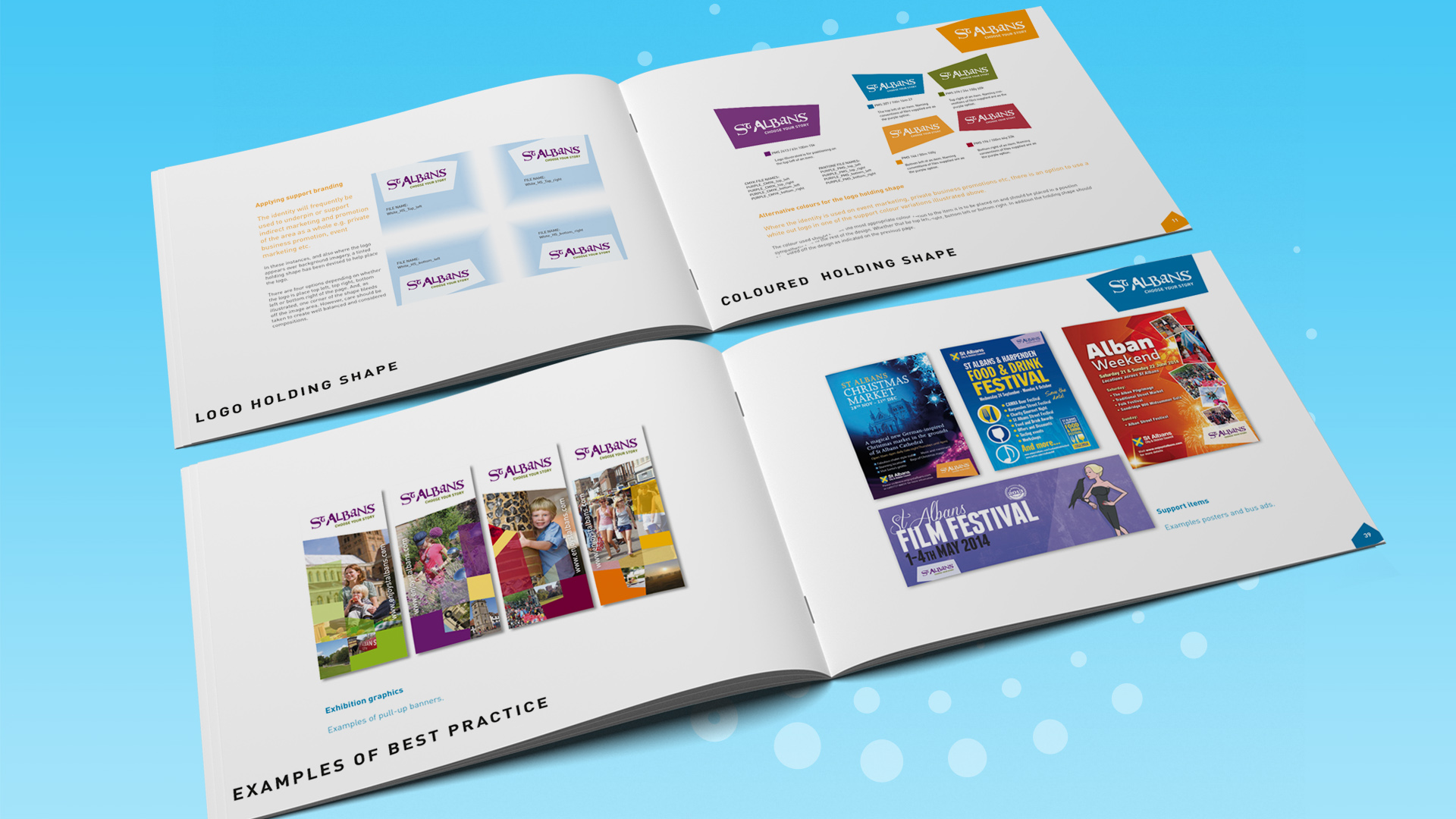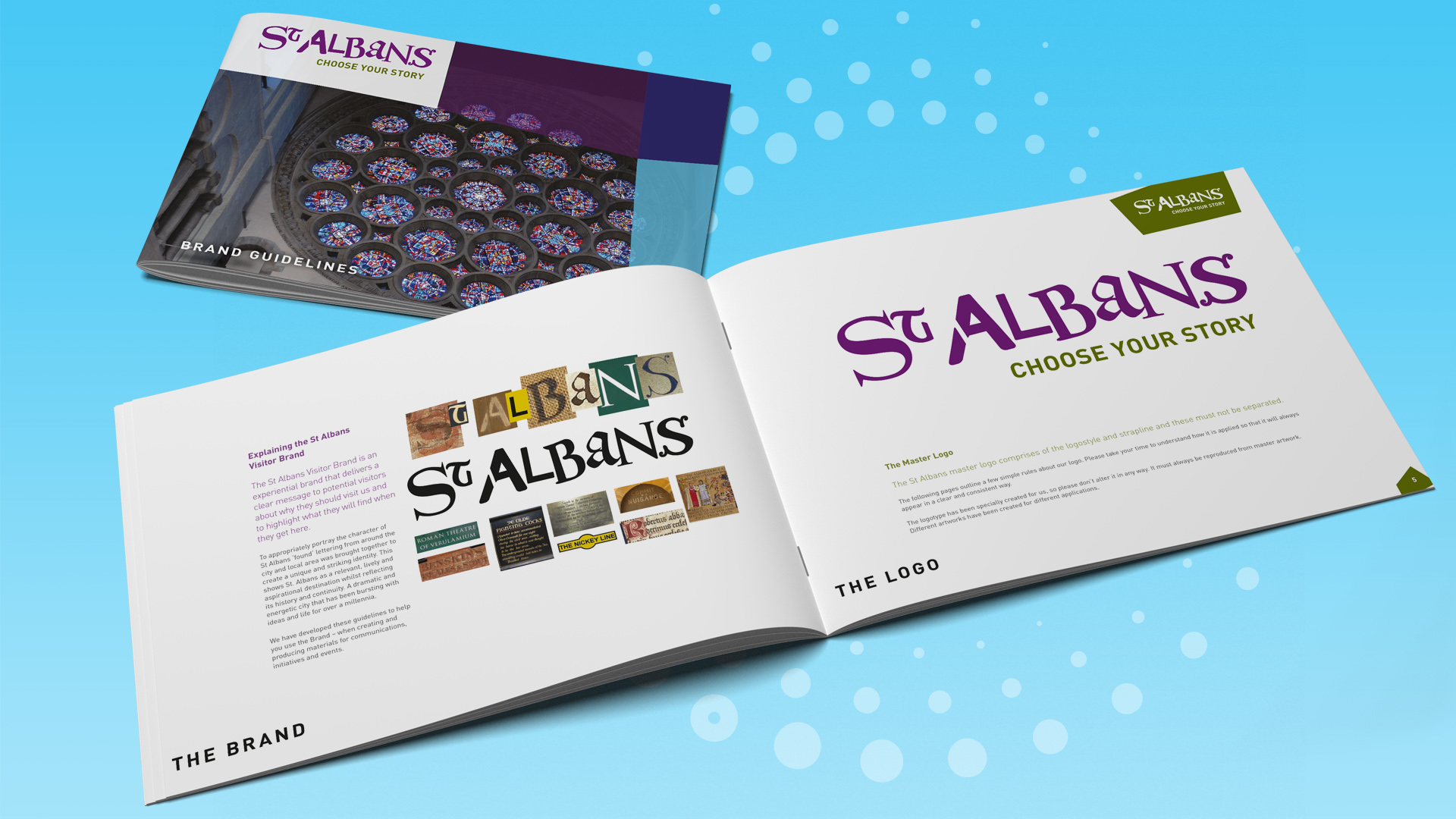 The chosen logo appropriately portrays the character of St Albans with ‘found’ lettering from around the city and local area being brought together to create a unique and striking identity. The brightly coloured brand furniture that unifies the brand is taken from St Albans Cathedral’s stained glass window. The strapline “Choose your story” invites the audience to create their own experience that they can tell family and friends about and becomes an open invitation to explore everything St Albans has to offer. To support the rebrand, we developed a style guide to ensure brand compliance moving forward.